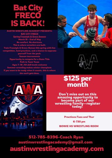 Austin Wrestling Academy provides a structured season curriculum for all 3 styles of wrestling. We practice 2-3x a week and travel most weekends to compete in tournaments. Athletes MUST have a USA Wrestling Athlete Card to participate in ANY Program or Camp. Cards can be purchased at, www.usawmembership.com. (Make sure to AFFILIATE your membership with our club!) Freestyle and Greco Starts March 10th!